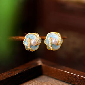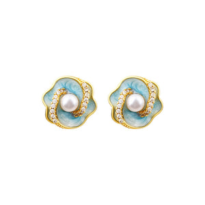 Small Sweet Potato Artificial Pearl Camellia Earrings, Real Gold Plating, French Vintage