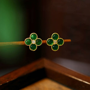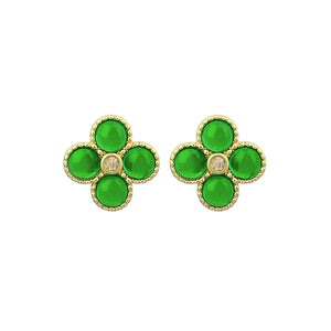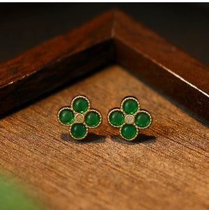925 Silver Needle Plated Imitation Gold Emerald Four-leaf Clover Round Bead Earrings for Women