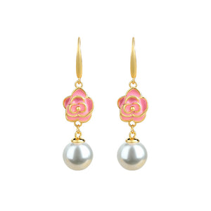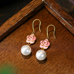 Enamel Glaze Camellia Crystal Pearl Women's Retro Earrings