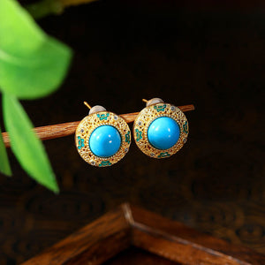 925 Silver Needle Gold-plated Blue Turquoise Ruyi Hollow Round Women's Earrings