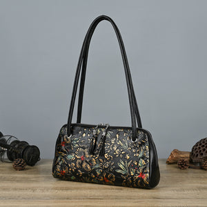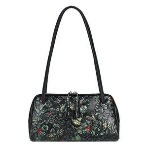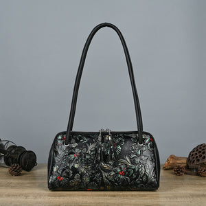 Retro Genuine Leather Underarm Baotou Cowhide Handmade Color-polished Handbag with Embossed Floral Design