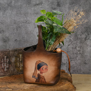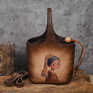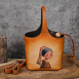 First layer cowhide lazy style printed blue bucket bag