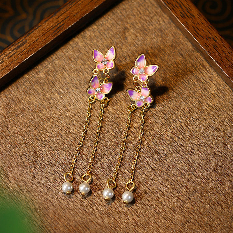 925 Silver Needle Tassel Pearl Butterfly Earrings for Women