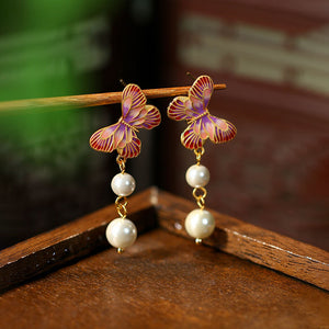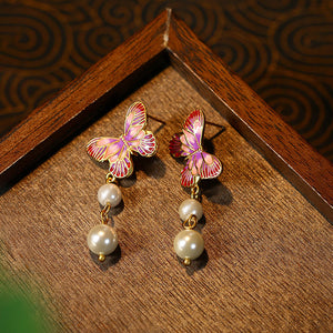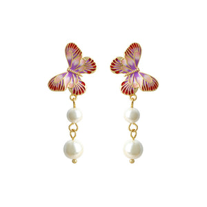 Elliform 925 Silver Needle Pearl Enamel Oil Drops Earrings, Butterfly Design