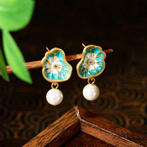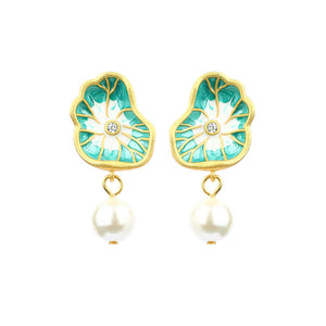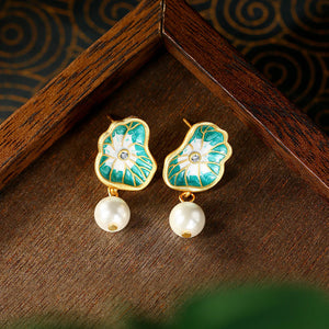 925 Silver Needle Earrings with Colorful Enamel, Faux Shellfish Pearl and Lotus Leaf Design for Women