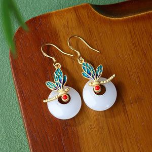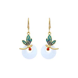 True Gold Color Gold-plated Imitation Hetian Jade Safety Buckle Enamel Dragonfly Round Earrings