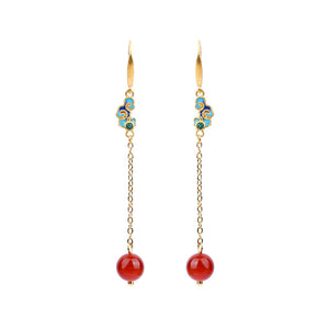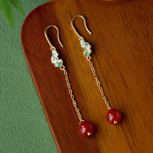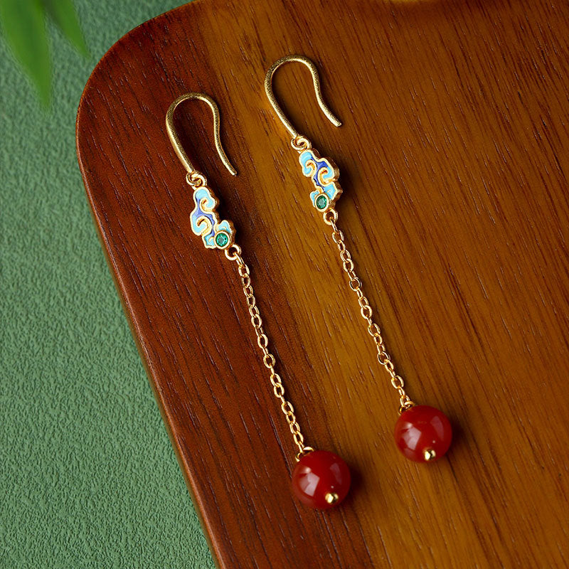 Antique Enamel Xiangyun Painted Gold Plated Natural Chalcedony Long Earrings