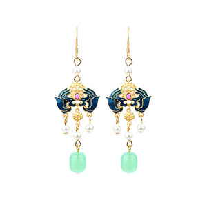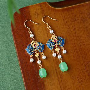 Antique Cloisonne Burned Blue Fushou Ruyi Imitation Hetian Jade Earrings