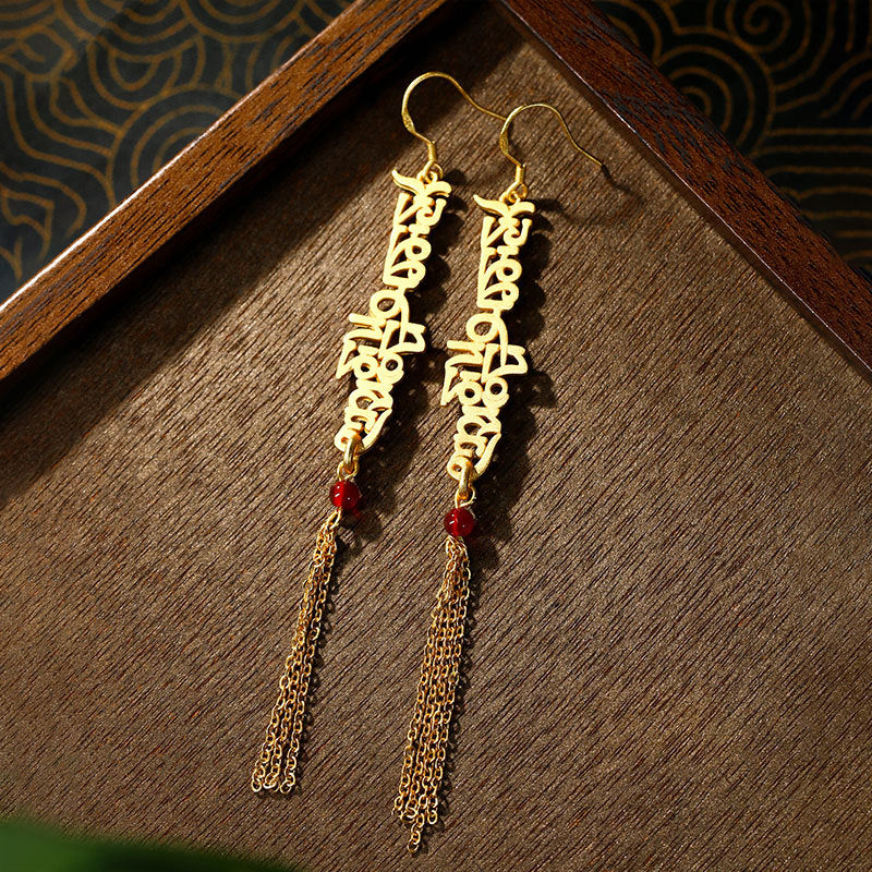 National Tide Style Diamond Sutra Text Buddha Zen Six-character Proverbs Tassel Earrings
