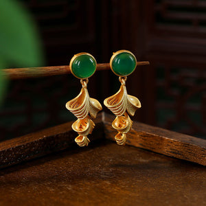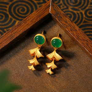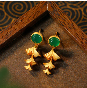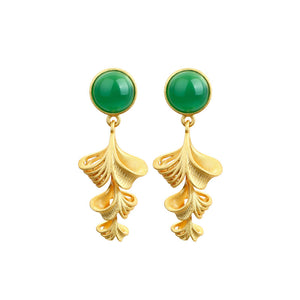925 Gold Plated Hollow Ginkgo Leaf Round Imitation Jade Earrings