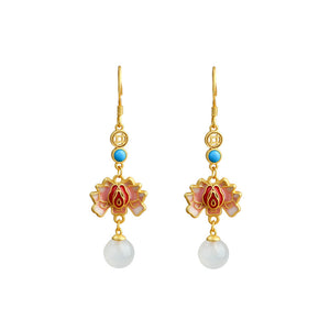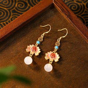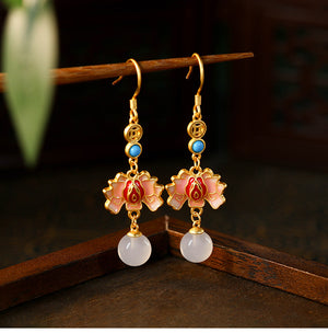 Enamel Painted Lotus Natural White Chalcedony Retro Earrings for Women