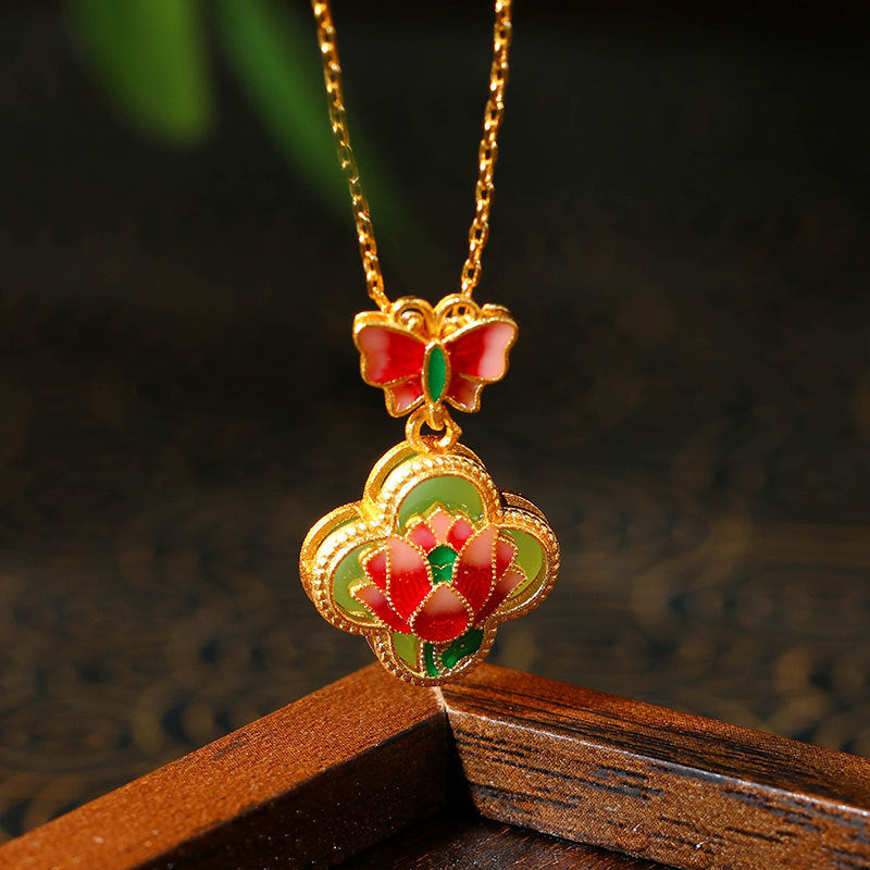 Real Gold Electroplating Butterfly Love Flower Enamel Imitation Jade Clavicle Necklace for Women