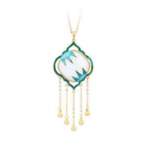 Enamel Painted Bamboo Leaf Square Pendant Necklace, Imitation Hetian Jade, 24k Gold Plated