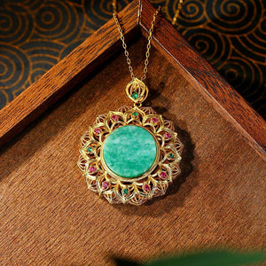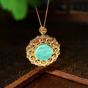 Gold Plated A Dry Green Imitation Jade Diamond Sunflower Round Brand Necklace