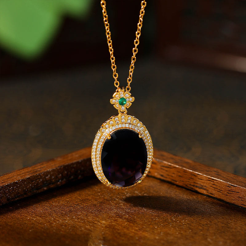 Retro Full Diamond Violet Gem Inlaid Oval Pendant Necklace