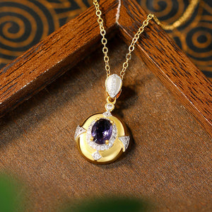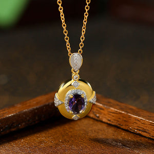Italian Textured Carved Gold Fantasy Violet Gem 18K Gold Plated Clavicle Necklace