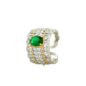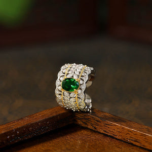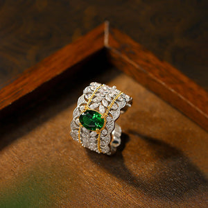 Italian Palace Hollow Pattern Double Color Gold Imitation Emerald Pigeon Egg Retro Ring