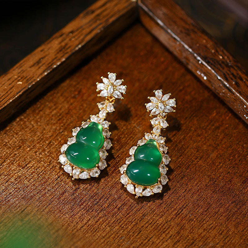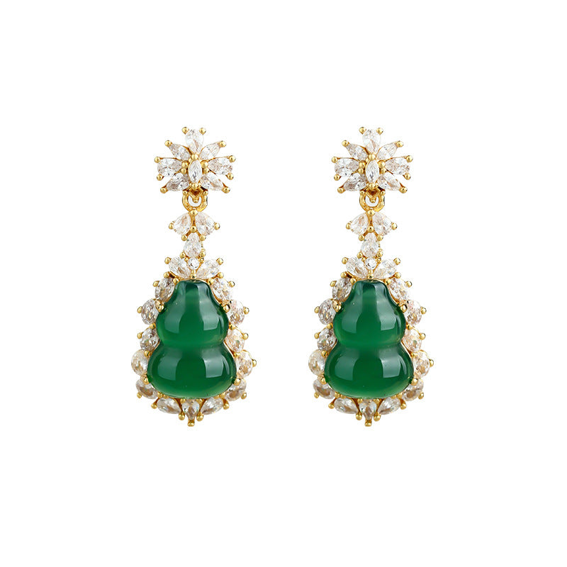Home Golden Silver Needle Earrings with Natural Green Chalcedony Gourd Egg Face Light Agate Pendant