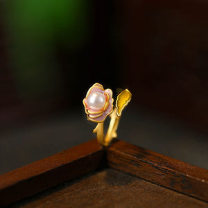 French Vintage Niche Pink Rose Oil Drop Ring with Crystal Pearl for Women