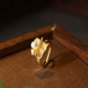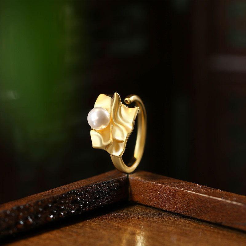 Exaggerated Metal Fold Style Pearl Open Ring for Women, Sweet and Cool