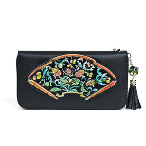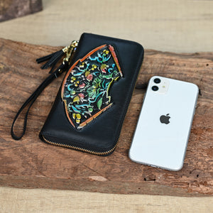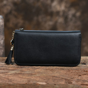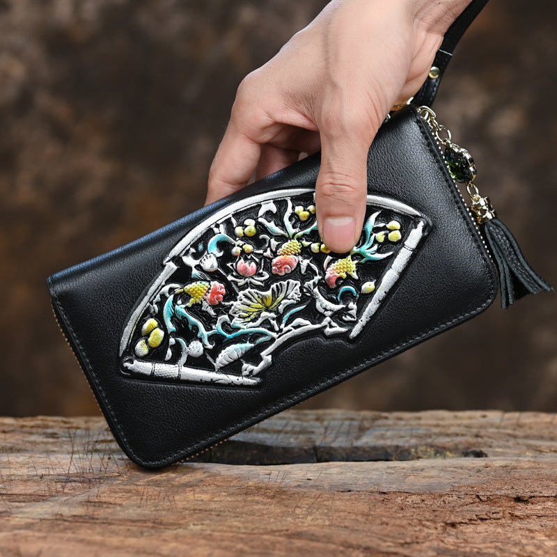 Vintage Cowhide Long Women's Clutch Bag, Multi Card Embossed Leather Zipper Bag