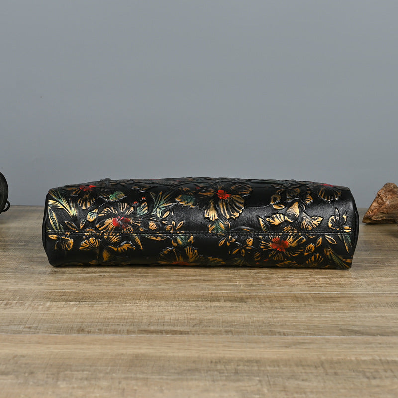 Retro Genuine Leather Underarm Baotou Cowhide Handmade Color-polished Handbag with Embossed Floral Design